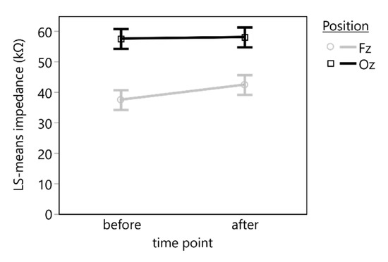 Least square means (LS means) and standard errors of the impedance of the marble electrodes measured before and after the VEP recording. A statistically significant difference in the impedance was found between the electrode positions Fz and Oz but not during the time between the recordings.