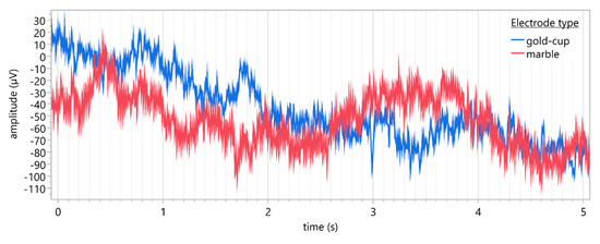 The increased noise caused by the higher impedance of the marble electrodes may have also led to the statistically significant higher mean amplitudes in the Fourier analysis of the different frequency bands of the recordings compared to those of conventional gold-cup electrodes. On average, the mean amplitudes recorded using gold-cup electrodes were between 67% and 82% lower than for marble electrodes. However, the mean amplitudes of the different frequency amplitudes obtained with marble electrodes showed a statistically significant high correlation to those recorded with conventional gold-cup electrodes.