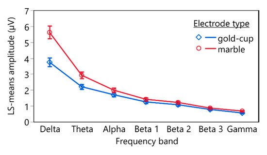 The linear mixed-effects model (n = 168, R2 = 0.95) revealed statistically significant effects of the electrode type (F(1, 143) = 52.0405, p < 0.0001), the frequency band (F(6, 143) = 349.3580, p < 0.0001), and the interaction between electrode type and frequency band (F(6, 143) = 2.2029, p = 0.0460) on the log-transformed mean FFT amplitude. Figure 5 depicts the estimated least square means and the standard error of means (whiskers) of the FFT amplitudes of the different frequency bands recorded with conventional gold-cup electrodes (blue) and marble electrodes (red).