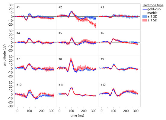 Individual VEP waveforms of the participants (grand average of 3 × 64 single sweeps). Recordings were done using conventional gold-cup electrodes (blue traces) and marble electrodes (red traces). Shaded areas indicate ±1 standard deviation. No cleansing or abrasion was used for the marble electrodes. Both electrode types resulted in comparable recordings, and the line noise was mostly eliminated through averaging.