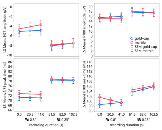Figure 7 shows the least square means of the peak times and amplitudes of N75 and P100 acquired using gold-cup and marble electrodes using the two different stimulus check sizes—0.8° and 0.25°—over the recording duration, along with their standard error of means.
