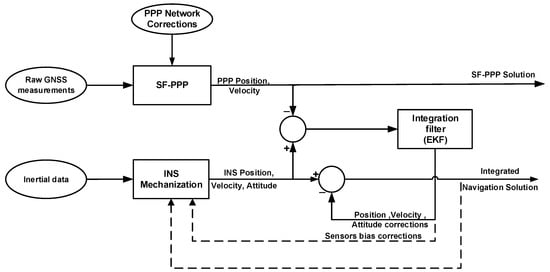 Figure 1 shows the block diagram of the developed PPP/INS integrated system. The estimated navigation parameters and sensor errors are fed back to the mechanization module in a closed-loop configuration. Thus, the error states are reset every epoch which contributes to preserving the linearity assumption of the KF. The rest of this section gives more details about the implemented SF-PPP, INS mechanization, and the EKF system and measurement models.