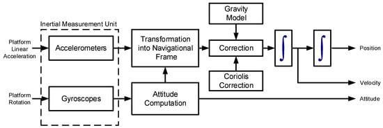 A block diagram of the INS mechanization process [11]. The inputs to the mechanization process are the accelerations and rotations measured by the inertial measurement unit. These measurements are transformed to the navigation frame and integrated to obtain the position, velocity, and attitude parameters.