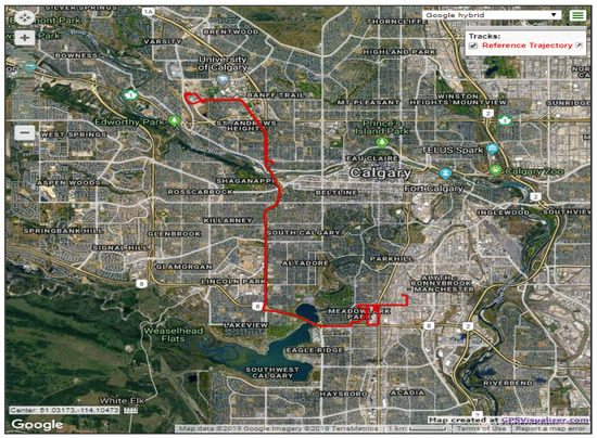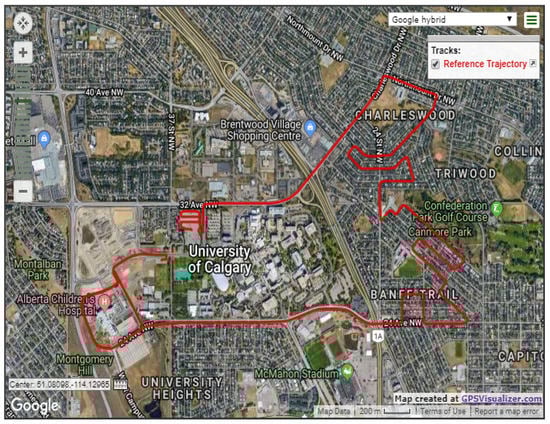The first road test trajectory lasted approximately 35 min in Calgary, Alberta, Canada. Figure 3 shows the trajectory on a Google map; the test started from an open-sky condition at the University of Calgary and near the Alberta Children’s Hospital, and then the car moved towards a residential area. The residential area was a typical suburban environment with community houses and trees on both sides of the road. Finally, the car moved back toward the university.