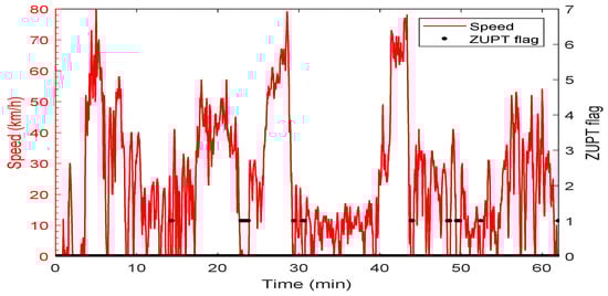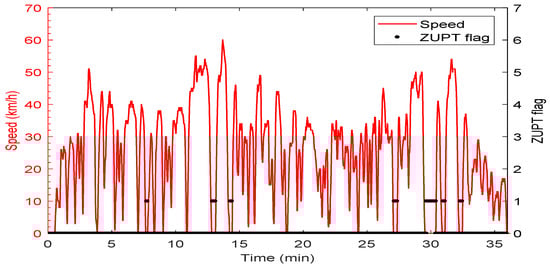 Vehicle speed and Zero-Velocity Update (ZUPT) flag of the first trajectory.