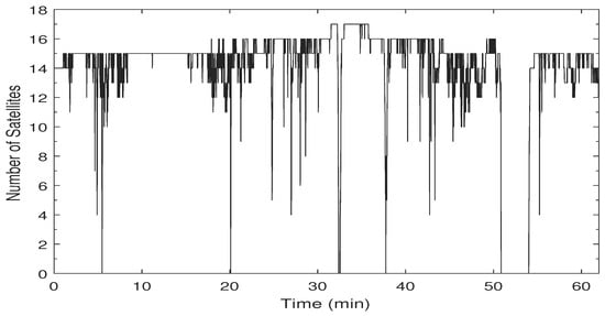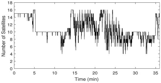 The speed profile and the corresponding ZUPT detection flag are shown in Figure 4. The car forward speed, measured by a car odometer, was less than 60 km/h with frequent stops and low-speed periods, which is typical for a suburban area. The ZUPT flag is raised whenever the vehicle is detected to be static. The value of the ZUPT flag in this test indicates the success of the ZUPT detection module with zero false alarms. A few misdetections were found that correspond to vehicle stops that are less than the adequate time needed to declare a stop with high confidence. Nevertheless, as mentioned earlier, the ZUPT update is not used when there is a reliable velocity update from the PPP solution. Figure 5 shows the number of satellites used in the PPP solution versus time. A minimum number of four satellites were seen in this test, whereas the maximum number was 16 thanks to employing both GPS and GLONASS satellites.