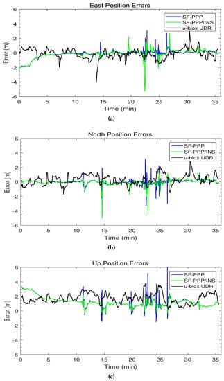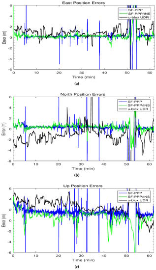 Figure 11 shows the 3D position errors within m for the SF-PPP, the integrated SF-PPP/INS, and the u-blox UDR solutions. The SF-PPP solution suffers from several large error spikes in the east, north, and up directions. Typically, these errors come with a status of “no fix” when the number of satellites is low and the solution is considered unreliable. On the other hand, the developed SF-PPP/INS solution could bridge all the momentary GNSS outages due to overpasses with a sub-meter RMS horizontal error, and provide a continuous solution even in the underground parking. The u-blox UDR position errors are worse than the developed PPP/INS system in most of the trajectory.