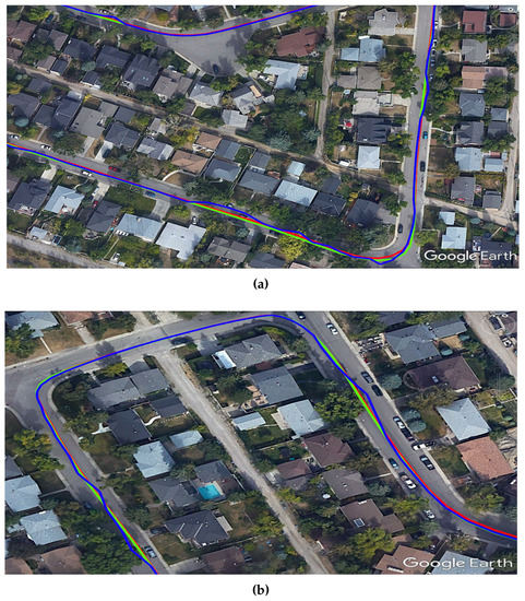 Two examples (a) and (b) of the developed SF-PPP/INS system performance in suburban areas showing how the system can provide a solution within the driving lane. The three displayed solutions are: reference (red), SF-PPP (blue), and integrated SF-PPP/INS (green).