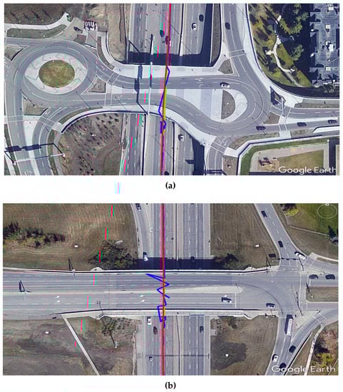The final step is to further demonstrate the advantage of our PPP/INS integration in preserving the lane-level accuracy in suburban environments. Figure 7 shows two examples, using Google Earth, of how trees and houses in a suburban environment can affect the PPP solution. It can be seen that the PPP-alone solution (blue) was affected several times by the partial outages of GNSS satellites and this drove the solution outside the driving lane. On the other hand, the integrated PPP/INS solution (green) maintained the lane-level position accuracy, following the reference solution (red) and providing a solution within the driving lane.