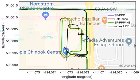 In the second part of the trajectory, Figure 13 shows on a Google map how the SF-PPP/INS solution outperforms the u-blox UDR solution in the complete GNSS outage in the underground parking. This is an example of how the developed system behaves in relatively long GNSS outages. Despite the errors reached the meter level, this performance is still acceptable given the utilized low-cost consumer-grade IMU and the long outage period (3 min).