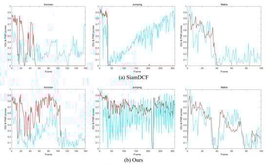 Visualization of the tracking result on three benchmark datasets including (Ironman, Jumping, and Matrix). (a) is a response graph of SiamDCF; and (b) is a response graph of ours. Red curves represent the IoU score of an estimated target and the ground-truth, while Green curves represent the normalized PNR value of the correlation response. Unlike the (a), the PNR graph of (b) is similar to that of IoU. This shows that the correlation filter can learn the robust features of the target online through the attention map generated from the structure–attention network.