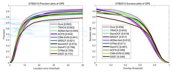 The precision and success plots on the OTB2013 [28] dataset by using one-pass evaluation.