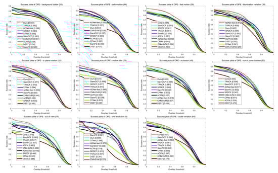 Table 2 and Figure 8 illustrate the precision scores of 11 video attributes on the OTB2015 dataset. The proposed method shows the best performances in seven attributes. In addition, Table 3 and Figure 9 demonstrate the success rate scores of 11 video attributes. Our tracker achieves the best performances in eight attributes and the second best score in Low Resolution. This clearly shows the effectiveness of our structure–attention network. Figure 10 also shows that the proposed method outperforms other trackers in success rate versus speed.