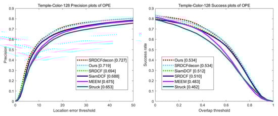 We compare our tracker on the TempleColor-128 [30] dataset containing 128 video sequences using one-pass-evaluation. Figure 11 illustrates both distance precision and overlap success rate on overall video sequences. Our tracker ranks second by a small margin on distance precision. However, while SRDCFdecon [33] has 1 fps of average speed, our tracker has over 89 fps in real time. Moreover, our tracker achieves the best result in overlap precision with SRDCFdecon. In particular, compared to our baseline tracker SiamDCF [17], our method outperforms SiamDCF with a large margin.