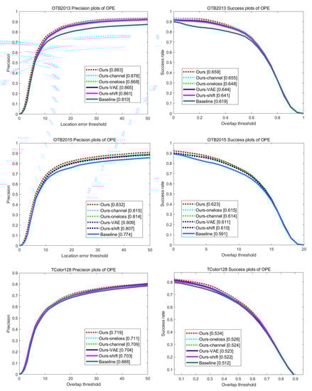 To analyze the impacts of the proposed method, we perform several ablation studies on OTB2013, OTB2015, and TColor128 datasets. We implement six variants of our tracker including: (i) Baseline is SiamDCF [17] which is our baseline Siamese tracking network, (ii) Ours-shift trains our structure–attention network using only shift noise, (iii) Ours-channel trains our structure–attention network using only channel-wise noise, (iv) Ours-VAE uses the standard variational auto-encoder (VAE) as structure–attention network, (v) Ours-oneloss trains the structure–attention network using only denoising reconstruction loss, and (vi) Ours is our complete model using both structure noises and the proposed reconstruction loss. Figure 12 shows the results on the overall datasets. Compared to SiamDCF, our complete model shows the best performances in both precision and success rate.