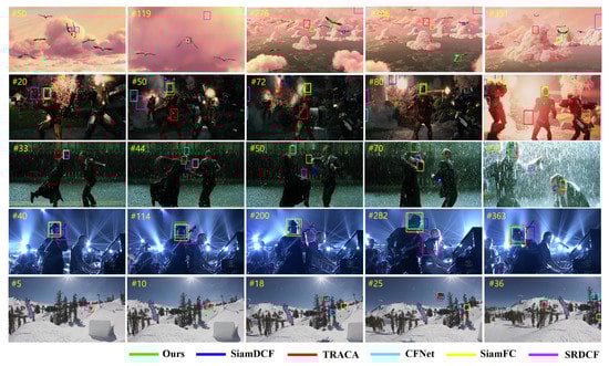 We perform a qualitative evaluation of our method with five existing trackers including: SiamDCF, SiamFC, CFNet, TRACA, and SRDCF. Figure 13 illustrates several frames from five challenging sequences on OTB2015 dataset (Bird1, Ironman, Matrix, Shaking, and Skiing). In the Bird1 and Ironman sequences, which are some of the most challenging sequences on the OTB2015 dataset, our tracker robustly tracks the target from the start to end frame even in the heavy occlusion and deformation. In the Matrix and Skiing, when the compared trackers struggling due to heavy scale variation and small size of target, our method can accurately estimate the scale of target. In particular, compared to our baseline tracker SiamDCF, our method shows the significant improvement in qualitative results. This proves the effectiveness of our structure–attention network which can robustly train the correlation filter even in the boundary effect problem.