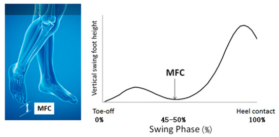 As illustrated in Figure 2, MFC was the vertical displacement of the toe from the walking surface during the mid-swing phase [21]. All gait data were described by mean ± Standard Deviation (SD) with the SD indicating intra-subject variability, reflecting the ability to maintain a consistent gait pattern across multiple step cycles.