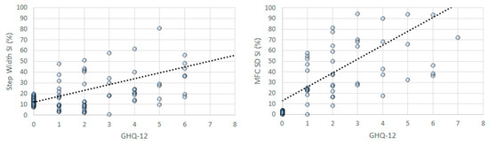 Multiple regression analysis indicated an overall r = 0.761/r2 = 0.580 when all gait parameters were entered into the regression model with GHQ-12 as the dependent variable. The regression model was determined to be statically appropriate for these data (F17,108 = 8.759, p < 0.001). Unstandardized coefficients further identified significant effects of independent variables as follows. An increase of one unit step width SI was predicted to increase GHQ-12 by 0.025 (t = 4.211, p < 0.001); step width SD SI adds 0.007 to GHQ-12 (t = 1.987, p = 0.049); double support time SD SI shows an incremental effect of 0.007 (t = 2.027, p = 0.045) and MFC SD SI was associated with a 0.013 increase (t = 3.339, p = 0.001). Obtained gait parameters in the current study thus indicated high predictability for GHQ-12 scores. Figure 3 plots the correlations between GHQ-12 scores and gait parameter asymmetry, excluding measurement errors to clarify the trend.