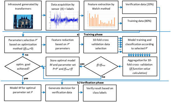 In a first step, the low frequency sound generated by the transformer or background is registered using a dedicated sensor device. The data are represented as time series X = [x1, x2, …, xn], where n is the number of samples. To reduce the volume of data in time series X, it is transformed into frequency domain vector F by the application of the Welch method. Then, using parameters P = [l, h, s, m1, m2, …, mk], the model is tuned. The parameters l = [2, 100], h = [2, 100], and l < h defines respectively lower and upper frequency bands, influences sample resolution, and mi, where i = 1, …, k, defines the ML algorithm parameters. In the first phase of the method (Figure 1a), initial parameters P’ are selected. The vector F size is reduced using l, h, and s parameters, and then it is used (together with class labels) to train the ML (tuned by mx parameters) using ten-fold cross-validation to increase the soundness of the result. The obtained classification accuracy (acc) is used to calculate fitness function ff (Equation (1)).
