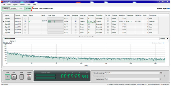 To operate the meter, the computer was used with dedicated software which was connected to a LAN cable measuring system. All operating parameters were defined using the PULSE LabShop application version 15.1.0, which forms an integral part of the setup shown in Figure 3. Apart from the option of the precise configuration of the device, this software provides tools with which to record measured signals and preprocess and visualize them in offline mode. This is a dedicated software package developed by Brüel & Kjær Sound & Vibration Measurement A/S.