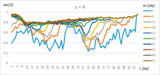 A comparison of Figure 11, Figure 12 and Figure 13 shows that a resolution of up to s = 8 does not significantly decrease the accuracy. Three frequency ranges can be identified, which makes it possible to classify transformers with a high level of accuracy, i.e., the frequency for l = 2 to 5 Hz, where the accuracy increases with range (h-l parameter), yielding optimal values for l = 2 Hz and h = 51 Hz. A second area could be found at around 50 Hz, but for this frequency, the accuracy did not increase equally rapidly with range. Finally, the highest level of accuracy could be observed for frequencies close to 100 Hz. In this case, the small range (h-l = 1Hz) was sufficient to obtain a level of high accuracy. The automatically detected frequency intervals yielded comparable levels of accuracy (above 90%).