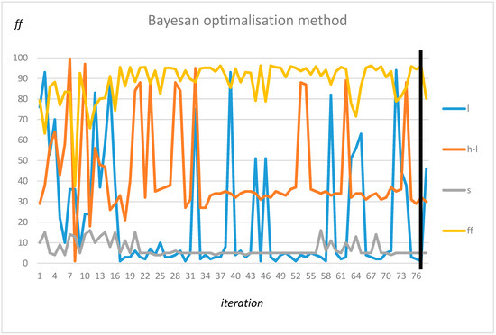Similar results were obtained using a random search: l = 4, h = 52, and s = 5. Finally, the Bayesan optimization method found the same interval as the exhausting method (l = 2, h = 32, and s = 5) parameters. The optimization procedure is presented in Figure 15.