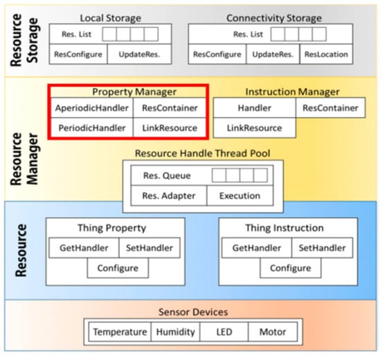 Figure 1 shows the Resource Management Layer for the MinT, which supervises the sensing data. The Property Manager module of Resource Management Layer controls the device sensors by applying a periodic or aperiodic sensing policy. In the aperiodic mode, the sensing operation is performed only when the client requests the sensing data. If the number of these requests increases, the time taken to process sensor data also increases, and the response of the device is delayed. In the periodic mode, once a fixed sensing period is set the sensor executes its operations according to the assigned period and saves the collected data. The saved sensor data is valid until the next sensing period commences. In the periodic mode, since the automatically saved sensor data can be transmitted to the clients, a constant response time is maintained. However, if the sensing period is set too long, the relatively recent sensor data cannot be delivered to the clients.