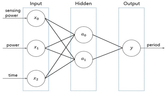 In this study, we use a BPNN as the learning algorithm, with a ReLU function on the hidden layer and sigmoid function on the output layer as activation functions. Figure 4 shows the configuration of the BPNN for smart sensing period control. The x0, x1, x2 of the Input layer correspond to the power consumed in a single sensing operation, the remaining power and the remaining time respectively. The output value of the y node in the Output layer represents a period.