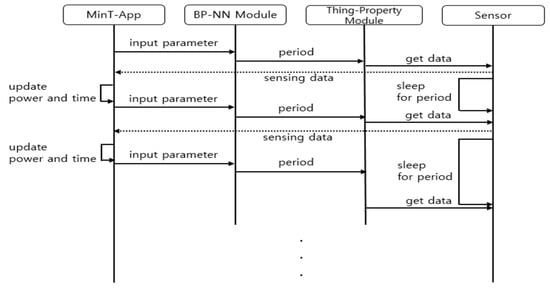 Figure 5 shows the sequence diagram between modules participating in the smart sensing period computation. The MinT-App is an application that uses the MinT software. Since this App is registered as a service supported by the MinT, the data sensing commands from the sensor driver can be retrieved. The sensing period control is computed as follows. First, the remaining time and remaining power in the MinT-App, and the amount of consumed power in a sensing operation, are sent to the BPNN directly. Next, the elapsed time and consumed power are calculated. Second, the processes of updating the values of remaining time and power are performed. The BPNN determines a suitable sensing period using both the data from the MinT-App and the pre-designed learning model. The sensing period is sent to the Thing-Property module and the BPNN waits until the MinT-App transfers the next batch of data. The Thing-Property module is one of the modules involved in the Resource Management Layer of MinT. This module sets the period of sensors based on the data received from the BPNN. It also requests the sensing data from the sensors. The sensor returns the sensing data and waits until the next sensing period. After the current sensing period has elapsed, it can be updated as a new sensing period by the BBNN.