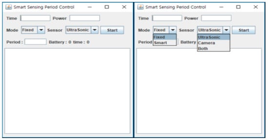 Figure 7 shows the GUI interface for the sensing period control process, which is constructed by a Java Swing program. The user can input time and power values in the text fields marked Time and Power. The Mode button is a combo box to select a fixed or smart period policy. If the Fixed mode is chosen, the fixed value is inputted in millisecond units. Otherwise, if the Smart mode is chosen, the Period field is will be inactive and the smart sensing is started. The sensing period is controlled automatically according to the working environment. The applied sensing period values are displayed on the user screen. The sensor combo box chooses the sensor for experiment, either the ultrasonic, the camera or both. The left-hand side of Figure 7 represents the remaining battery energy and time remaining until the target time. The dialog boxes in this figure show the remaining battery, remaining time and a log record of sensing period according to the current working conditions.