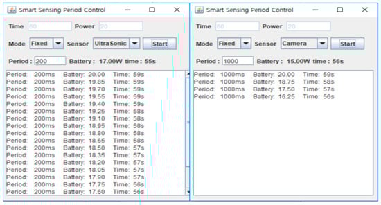Figure 8 shows screenshots of the process for an ultrasonic sensor and camera sensor with fixed sensing mode. The battery and time labels in the upper window represent the current values. The print values in the bottom window represent the previous data. From Figure 8 we can confirm that the sensors are working on the sensing period established by the user.