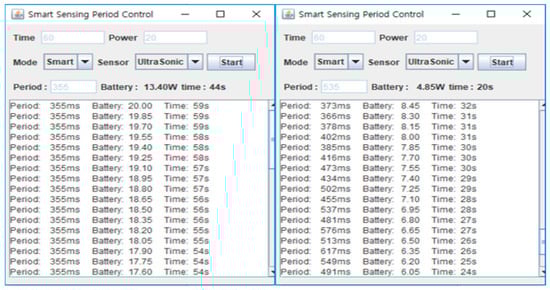 Figure 9 shows screenshots for the ultrasonic sensor when the smart sensing mode is applied. From the log it can be seen that, after the first sensing operation is started, a constant period is maintained for a short time. However, after the initial period passes, the sensing period changes according to the remaining battery power and time. If the available battery power is much less than that required to meet the target time, the sensing period becomes longer to compensate. On the other hand, if the battery power is sufficient, the sensing period will be shortened.