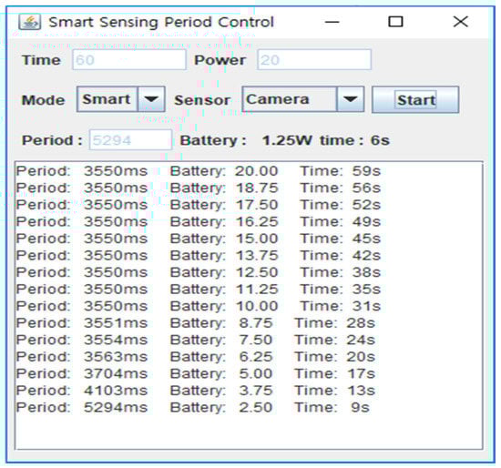 Figure 10 shows screenshots of the camera sensor when the smart sensing mode is applied. Like Figure 9, the constant sensing period is for some time maintained, but then changes as time passes. As shown in this figure, the period of the camera sensor is longer than that of the ultrasonic sensor. The camera sensor requires more power than the ultrasonic sensor per sensing operation. When they are deployed in the same circumstances, the number of sensing operations of the camera sensor is limited compared to the ultrasonic one. As a result, the sensing period found from the BPNN is longer than that of the ultrasonic sensor’s.