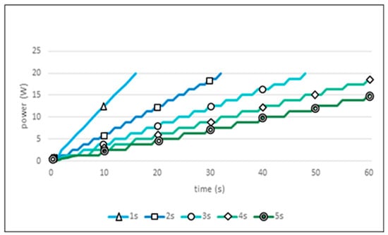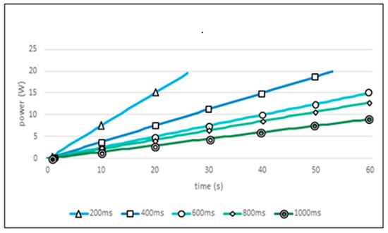 Figure 11 shows the experimental results for the fixed sensing period policies. The horizontal axis represents time and the vertical axis the consumed power. In this figure, the ideal graph type is that achieved when the 20 W is completely exhausted as the 60-s time limit is reached. From Figure 11, it can be seen that the ultrasonic sensor has an ideal power consumption between 400 ms and 600 ms. When the 200 ms sensing period is applied, the energy source is exhausted in 30 s, half of the 60-s target time for this experiment. On the contrary, when a 1000 ms sensing period is applied, it uses only the half of the available power during the entire 60-s working time, and a surplus of 10 W remains.