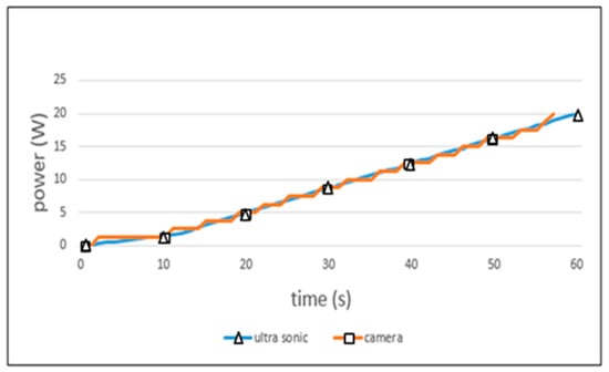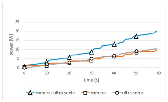 Figure 14 shows the power consumption of 2 sensors when operated simultaneously. In this figure, the camera and ultrasonic labels represent the quantity of power consumed by each sensor as the time passes. The camera + ultrasonic label represents the sum power consumption of both sensors. The figure shows that the total power (20 W) was consumed within 59 s. Even with the small power surplus remaining, the performance is improved compared to the fixed period policy results of Figure 11 and Figure 12. Several iterated experiments were necessary to find the ideal period in the case of fixed sensing period policies; however, the smart sensing period policy automatically searches out the ideal sensing period value, based on the given environmental conditions. In addition, even if both sensors are operated simultaneously, the smart sensing policy autonomously controls their power consumption. As a result, this can enable both sensors to work effectively up to the target time.