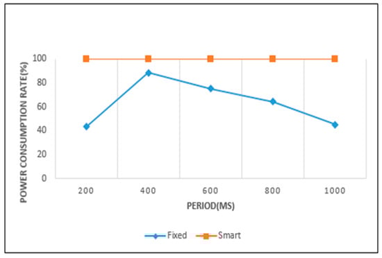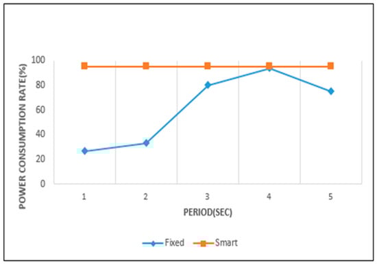 Figure 15 and Figure 16 show the power consumption rate of the ultrasonic and camera sensors. The horizontal axes represent the fixed periods and the vertical axes their power consumption rates. The power consumption rate is found from the taken for complete power consumption over total (target) time, and the remaining power over total power. It is calculated from Equation (5). In Equation (5), is the time at which all power is exhausted. Pr is the power remaining from the total available power. In the case of , if the total time is reached and the total power is not exhausted, it is regarded that Tc is equal to total time T.