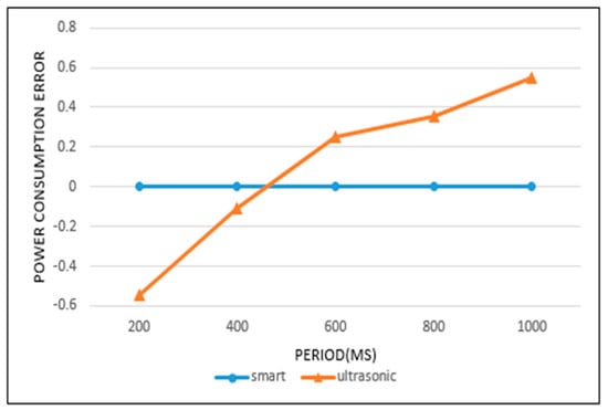 From Figure 17 and Figure 18 we can analyze in detail the results of Figure 15 and Figure 16. In Figure 15, the power consumption rate for the ultrasonic sensor is highest with a 400 ms sensing period. However, we find that a negative error exists at 400 ms in Figure 17. This means that a small power wastage exists for this period. The ultrasonic sensor did not operate up to the target time at 400 ms, because the available power was completely consumed. In Figure 15, when a 1000 ms period is used, the power consumption rate is seen to be lowest. However, in Figure 17, the 1000 ms period shows a large positive error. This means that even if sensing operations continue until the target time, a considerable amount of power remains.