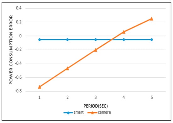 In Figure 15, the smart sensing period shows a power consumption rate of 100%. It indicates that a waste or surplus of power consumption did not occur in the sensing processes. This result is confirmed in Figure 17, with a 0 error value. In Figure 16, the camera sensor shows the highest power consumption rate when operating on a 4-s sensing period. As a result, an error value of 0 was recorded for the 4-s sensing period in Figure 18. Otherwise, the 1-s period in Figure 16 showed the lowest power consumption rate, and is represented by large negative error value in Figure 18. This signifies that the sensing operation was no longer supported, as the available power was completely exhausted. In this case, the extension of the current sensing period is necessary to achieve an efficient battery power usage. In Figure 16, when the camera sensor uses the smart sensing period policy, the power consumption rate was close to 100%. This was represented by a small negative error in Figure 18, so the smart sensing period policy showed a small power wastage. Despite this we can, from all experimental results, confirm that the smart sensing period showed a more efficient power consumption rate than the fixed sensing periods.
