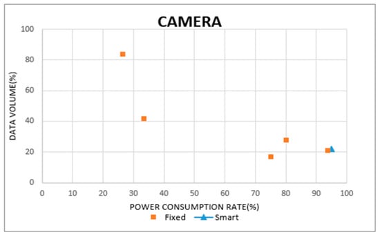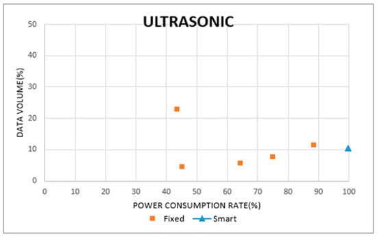 Figure 19 and Figure 20 show the data collection rates for the ultrasonic and camera sensors. The horizontal axes display the power consumption rate of the sensors, and the vertical axes indicate their data collection rates. In Figure 19, the smart sensing period is found with a 99% power consumption rate, and a 10% data collection rate. In the case of fixed sensing periods, some cases represented a higher data collection rate than the smart sensing period. However, since their power consumption rate was below 50%, the sensing operations were stopped before their target times. From these results, we can confirm that the fixed sensing periods cause a wastage or surplus in power consumption. In Figure 20, the smart sensing period recorded a power consumption rate of 95%, and a data collection rate of 21%. Otherwise, a fixed sensing period recorded data collection rates of over 80%, but the power consumption rate was below 30%. To sustain the sensing operation with a high data collection rate, the fixed sensing period requires other power supplies, instead of battery power.