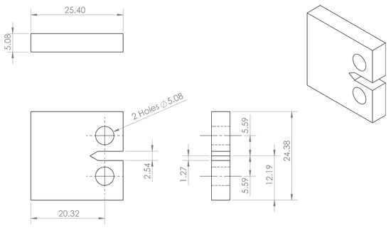 Tests were conducted to investigate the ability of UAM-embedded FBG sensors to detect cracks in samples. The geometry of the coupons and testing procedures are based on ASTM Standard E647: Standard Test Method for Measurement of Fatigue Crack Growth Rates [30]. This test involves the cyclic tensile testing of notched compact tension (CT) specimens to induce crack growth. A clevis pin system was designed to be held in the load frame and attached to the CT specimen. A drawing of the CT specimen used in this testing is shown in Figure 2.
