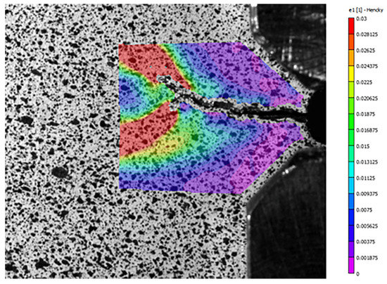 Strain field reported by the DIC system during cyclic loading of a CT specimen.
