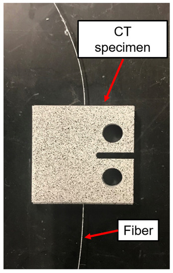 Compact tension (CT) specimen with one embedded FBG sensor built using UAM used in crack initiation and strain tracking. A fine speckle has been applied for DIC tracking. The FBG sensor is located 3 mm from the tip of the notch.