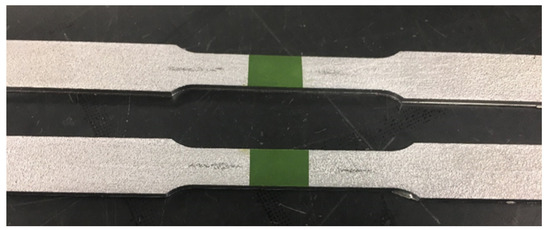 Coupons were based on ASTM Standard E8: Standard Test Methods for Tension Testing of Metallic Materials, with FBG sensors embedded in the middle of the sample [31]. A drawing of the coupons is shown in Figure 7. A Thermo Scientific Thermolyne furnace was used for testing. The temperature was verified using a K-type thermocouple and the strain was verified using an HPI Inc. HFK-12-125-6-ZCW high-temperature strain gauge that was fixed with epoxy to the coupon as pictured in Figure 8. Data was recorded using a National Instrument 9215 data acquisition module.