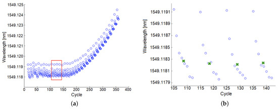 (a) Peaks of the FBG strain signal during the pre-cracking phase. The DIC was triggered with a low peak (not shown) every eight cycles. (b) Detailed view extracted from the red box. The green x markers indicate the mean of each set.