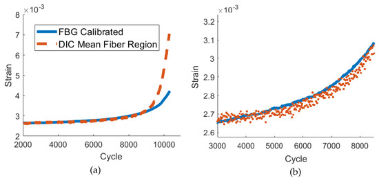 Vertical strain measurements from an FBG sensor UAM-embedded into a CT specimen and average strain from DIC in the region of the FBG; (a) from the end of the pre-cracking phase (∼cycle 2000) to sample failure (∼cycle 10500); (b) detailed view of (a) from approximately cycle 3000 to 8500.