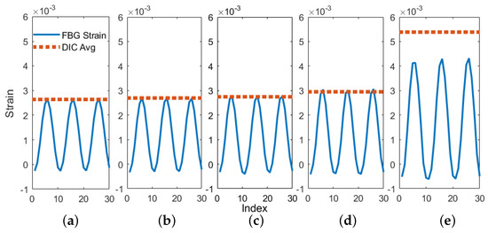 Comparison of the FBG strain signal and the average peak strain from DIC in the region of the FBG after (a) 2000, (b) 4000, (c) 6000, (d) 8000, and (e) 10,000 cycles.