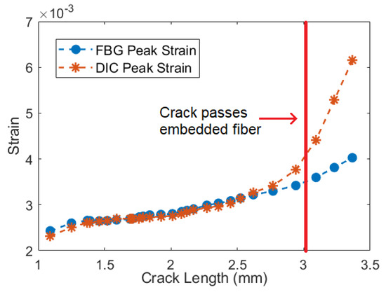 FBG strain signal and average peak strain from DIC in the region of the FBG as the crack length increases.