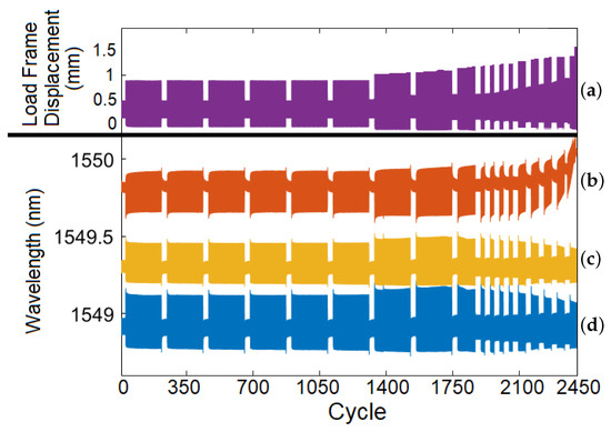 (a) Load frame displacement and FBG signals from sensors embedded (b) 9 mm, (c) 6 mm, and (d) 3 mm from the notch over the entire prognostic analysis test.