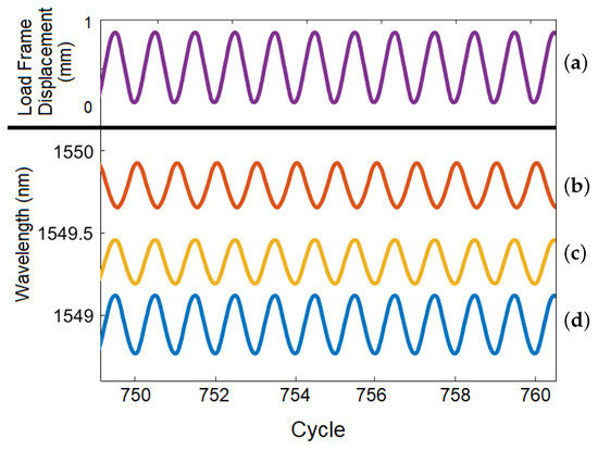 Detailed view extracted from Figure 13 between cycles 749 and 761. (a) Load frame displacement and FBG signals from sensors embedded (b) 9 mm, (c) 6 mm, and (d) 3 mm from the notch. Note the alternating crack-growth region (high wavelength amplitude) and low-amplitude region (low wavelength amplitude). The number of cycles of the crack-growth phase was reduced toward the end of the test to ensure that enough data was obtained as the crack grew.