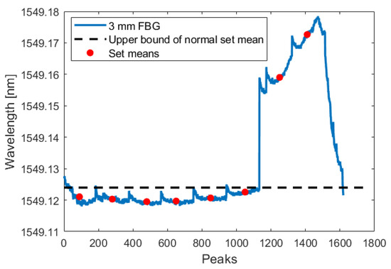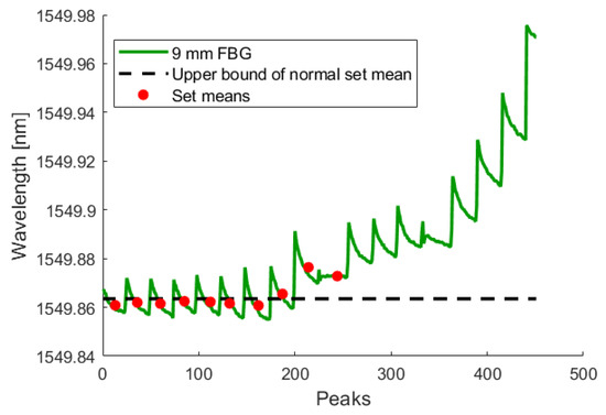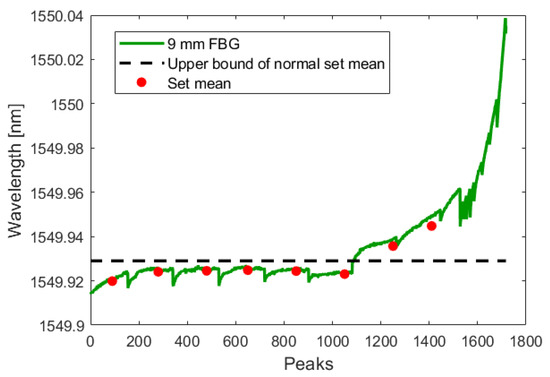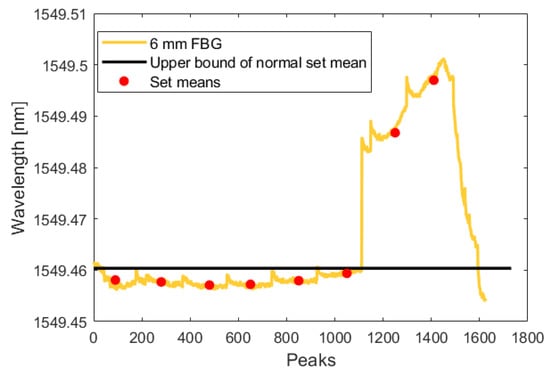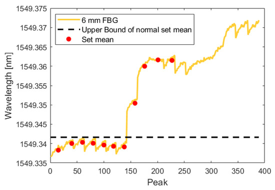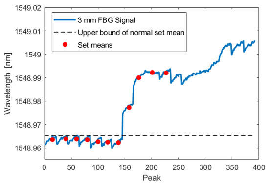During the test, the crack initiated and grew in a single cycle to a length of 0.350 mm. Using the analysis technique described in Section 3.1.1, this increased crack length was detected by all three fibers in both the crack-growth phase and the low-amplitude phase. The following figures show the FBG signal as a solid line and the calculated upper bound of set means with no crack as a dotted line. The red circles indicate the mean of each set. When the red circle crosses above the dotted line, the FBG detects a crack. As illustrated by Figure 15, Figure 16, Figure 17, Figure 18, Figure 19 and Figure 20, all embedded FBGs successfully detect the crack after the seventh high-amplitude set when the crack reaches a length of 0.350 mm.
